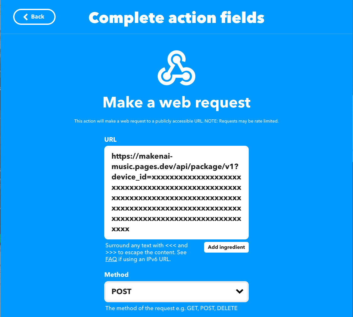 URL => さきほどコピーしたIFTTT用のURLを貼り付けましょう。